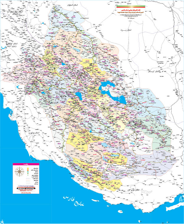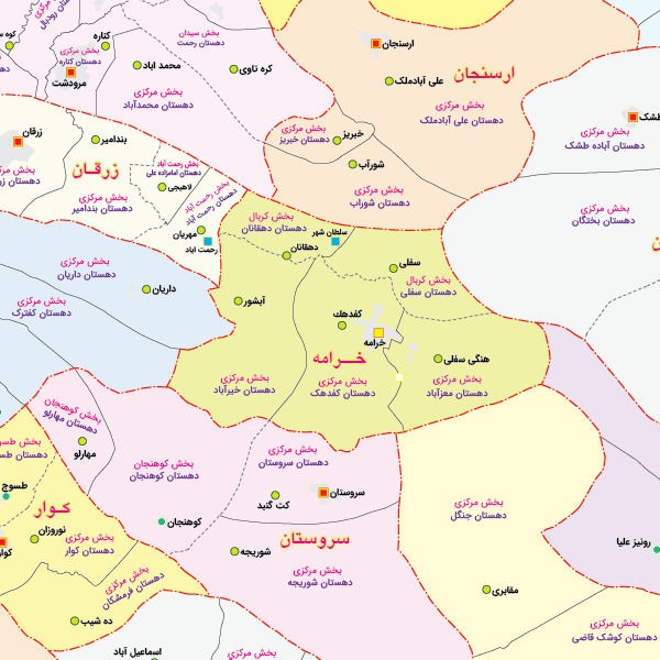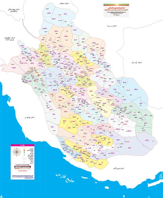نقشه تقسیمات استان فارس در مقیاس 1:500000 ترسیم شده است. این نقشه به منظور نمایش مرزها و مراکز تقسیماتی شهرستان ، بخش و دهستان ایجاد شده است و امکان سفارشی سازی آن وجود دارد. اندازه واقعی عرض 115 سانتیمتر و طول 140 سانتیمتر هست.